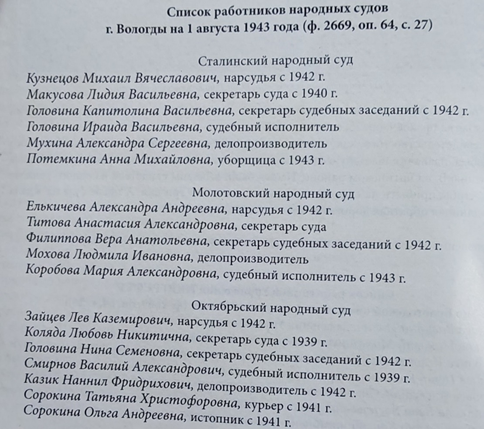 По имеющимся данным в Вологде в военное время действовало 3 народных суда (Сталинский, Молотовский и Октябрьский).