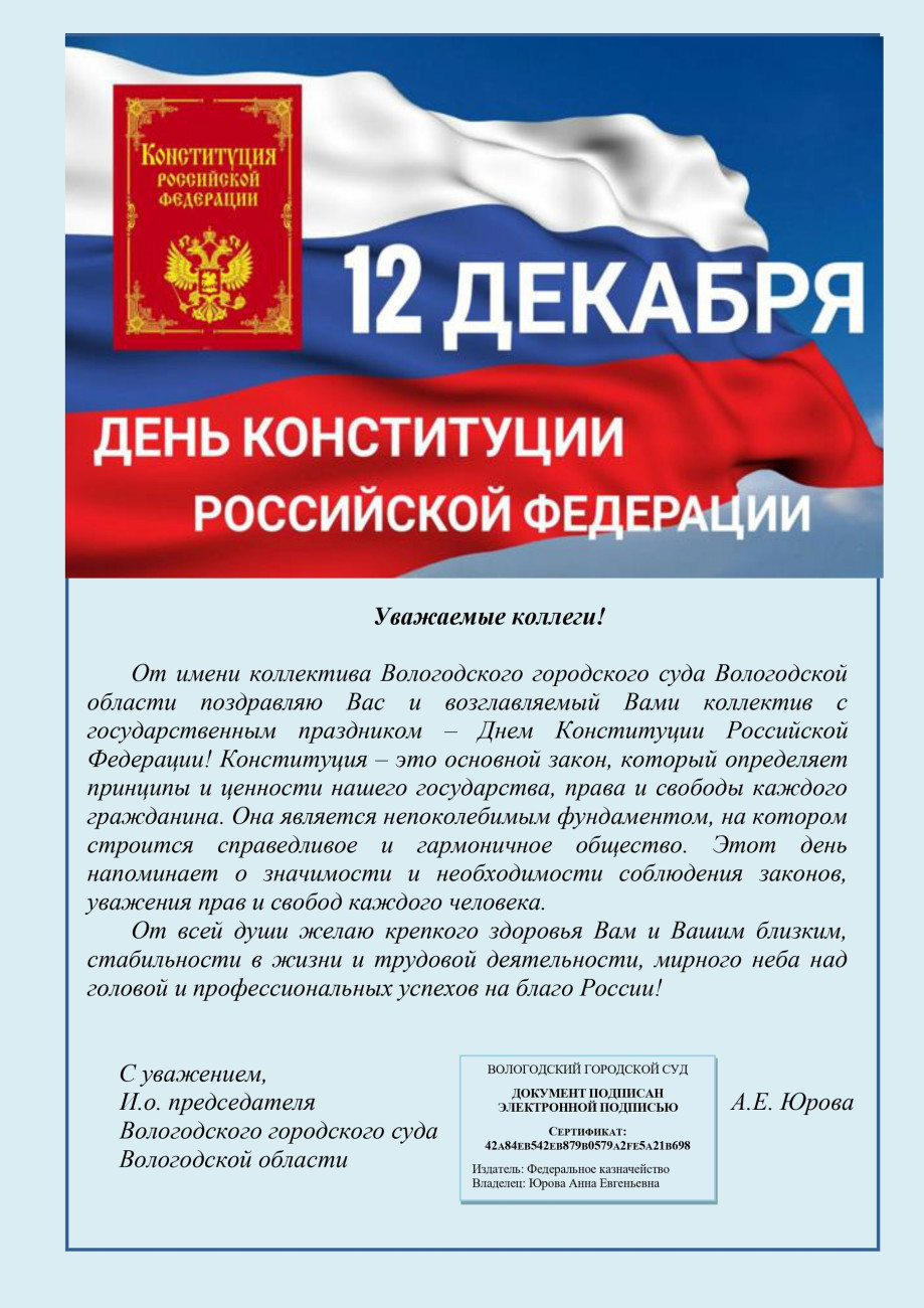 В честь Дня Конституции Российской Федерации с поздравлением обращается и.о. председателя Вологодского городского суда А.Е. Юрова.