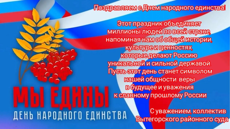 6.11.2025 С Днем народного единства! Коллектив Вытегорского районного суда посвящает свое поздравление чувству уважения к нашей Родине. #суды35регион_мероприятия #суды35регион_Вытегорский_районный_суд #суды35регион_ОПС Оставьте комментарий Ваше ФИО Комментарий