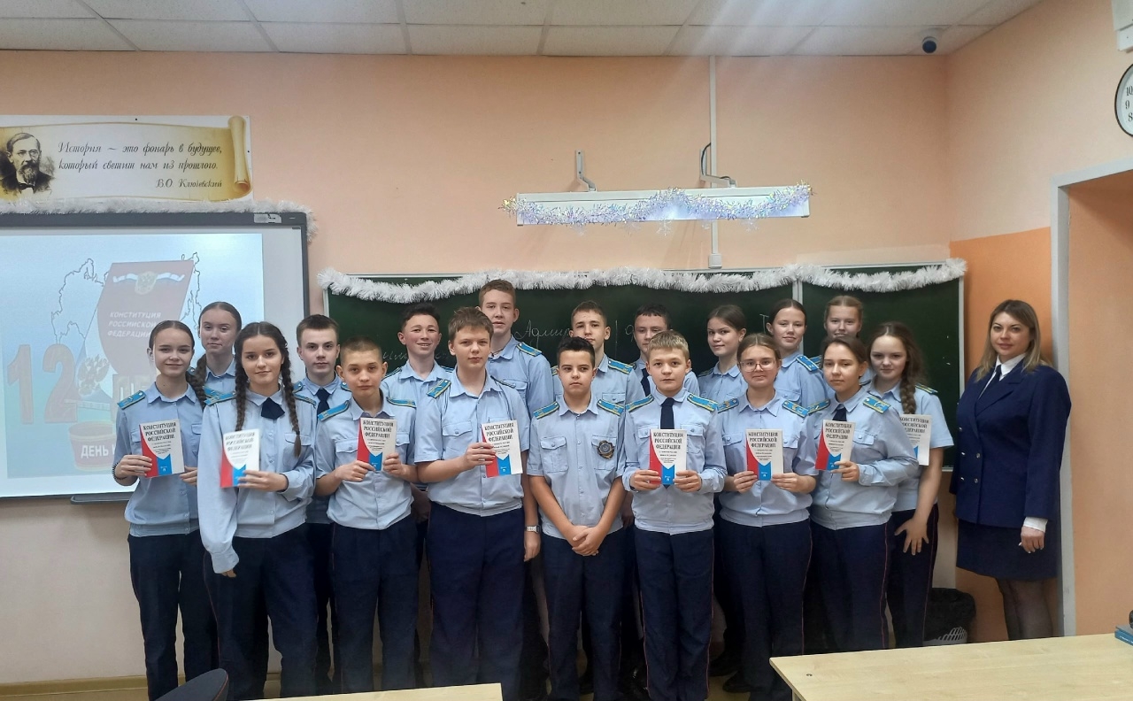 В этот праздничный день помощник судьи Верховажского районного суда Вологодской области Галина Грибанова посетила МБОУ «Верховажскую среднюю школу им. Я.Я. Кремлева» и провела для учеников 8а кадетского класса лекцию о главном законе нашей страны – Конституции. Она рассказала школьникам об истории создания Конституции Российской Федерации, о правах и обязанностях человека и гражданина, закрепленных в основном законе страны, о судебной системе в Российской Федерации.