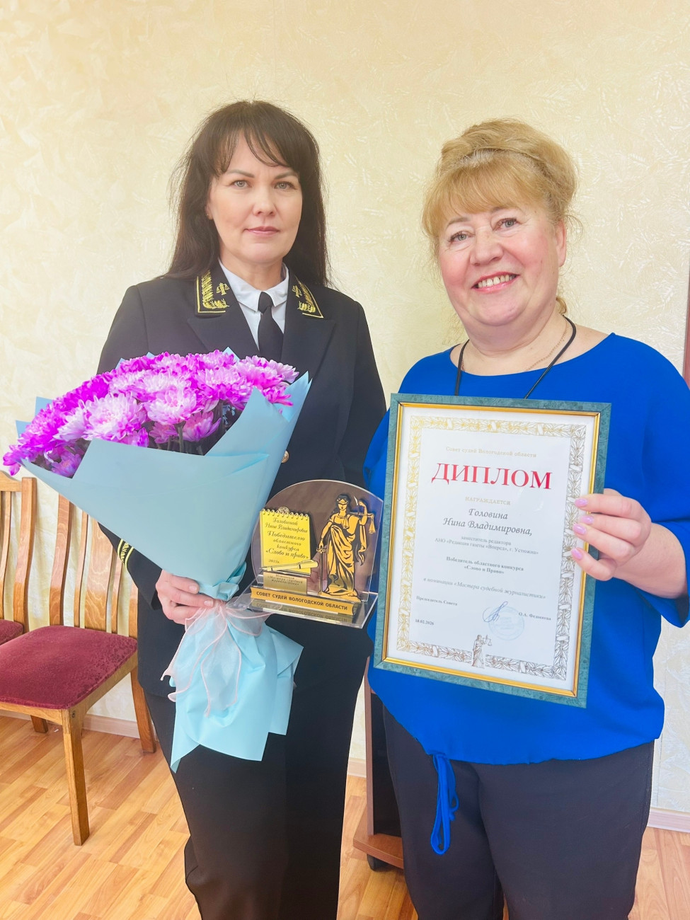 19 марта 2026 года председатель Устюженского районного суда Копылова Н.В. в торжественной обстановке вручила награду победителю областного конкурса «Слово и Право» в номинации «Мастера судебной журналистики» заместителю редактора АНО «Редакция газеты «Вперед» Головиной Нине Владимировне.