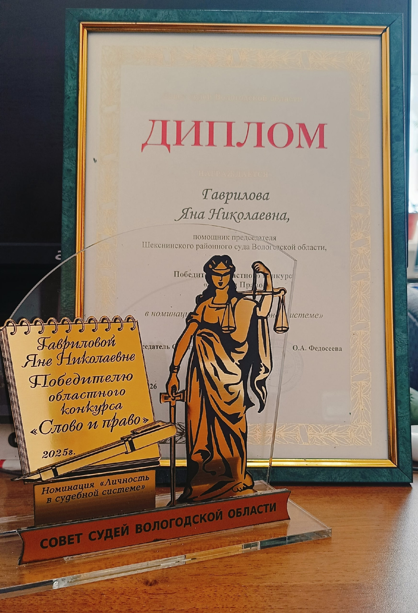 Памятным призом и дипломом награждена победитель в номинации «Личность в судебной системе» Гаврилова Яна Николаевна, помощник председателя Шекснинского районного суда.