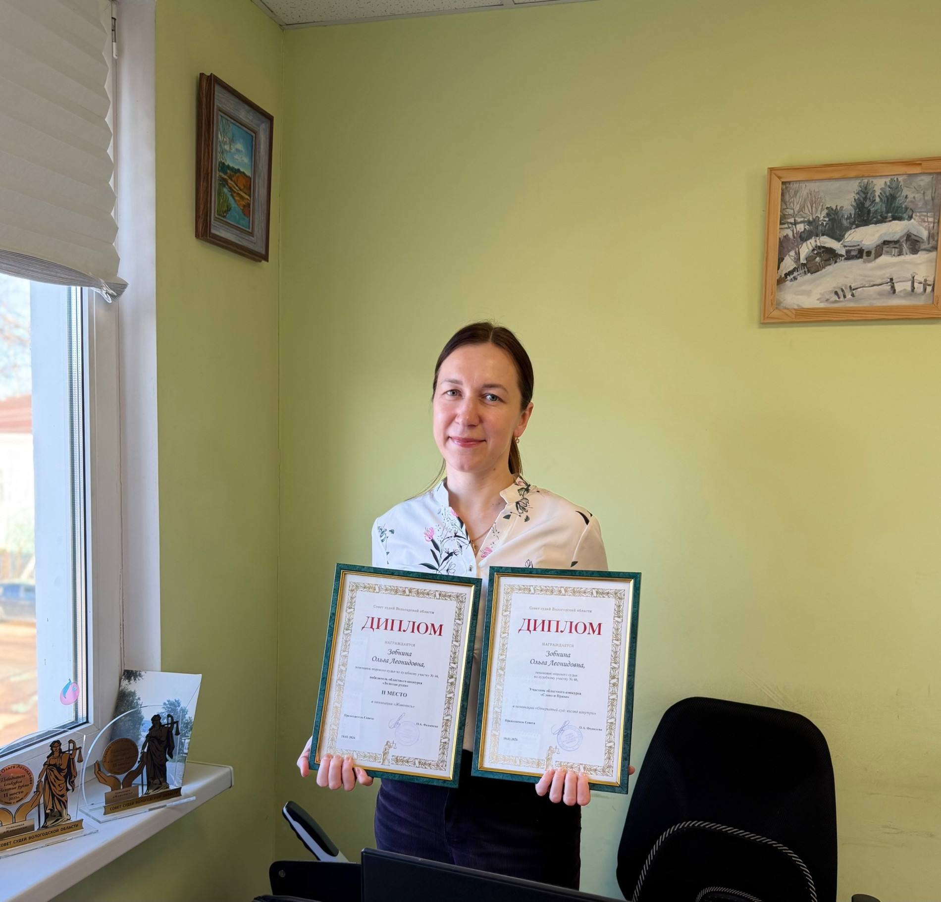 Дипломы участников были переданы авторам достойных работ конкурса. Среди награжденных – Мокиевская Светлана Николаевна, заместитель председателя Вологодского районного суда; Янковский Антон Александрович, обозреватель Информационного агентства «Вологда Регион»; Зобнина Ольга Леонидовна, помощник мирового судьи по судебному участку № 46 (кроме того, удостоенная награды за 2 место в номинации «Живопись» конкурса «Золотые руки»).