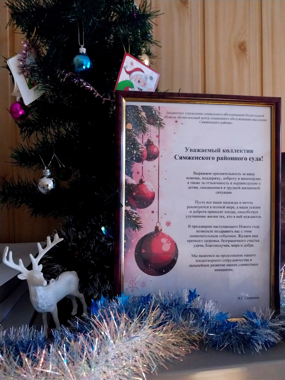 Коллектив Сямженского районного суда принял участие в праздничной акции «В Новый год с добрым сердцем». Судьи и сотрудники собрали коробку сладостей и передали её в местный комплексный центр социального обслуживания населения, чтобы каждый ребёнок из семьи, оказавшейся в трудной ситуации, получил праздничный подарок под ёлкой.
