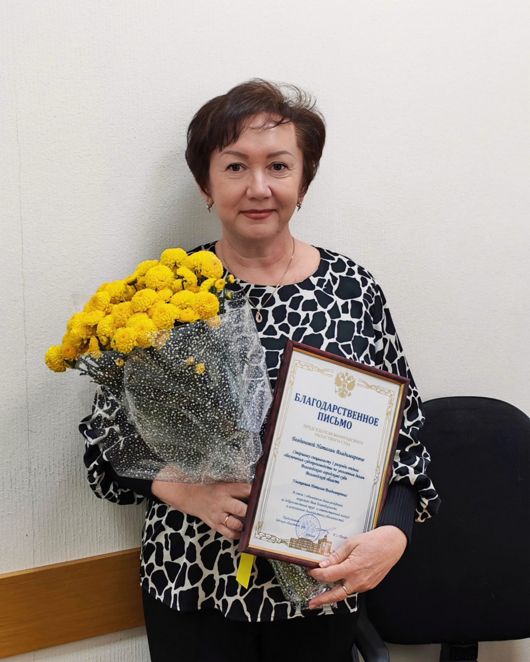 И в этот праздничный день председатель Вологодского городского суда от имени председателя Вологодского областного суда вручила Наталии Владимировне еще одну заслуженную благодарность.