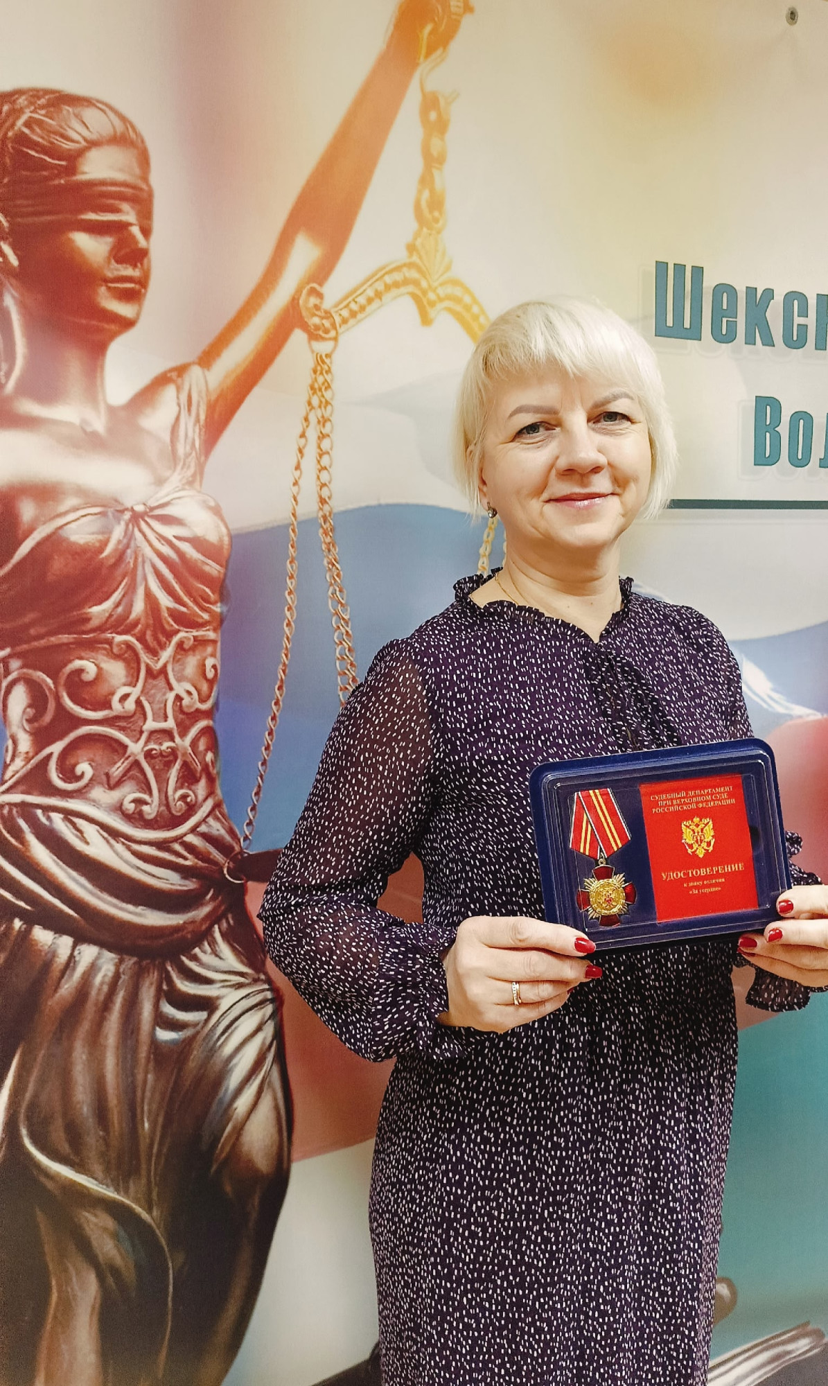 Председатель Шекснинского районного суда Константин Александрович Потапов в торжественной обстановке вручил администратору суда Смирновой Ларисе Анатольевне заслуженную награду - ЗНАК ОТЛИЧИЯ Судебного департамента при Верховном Суде РФ «За усердие» II степени.