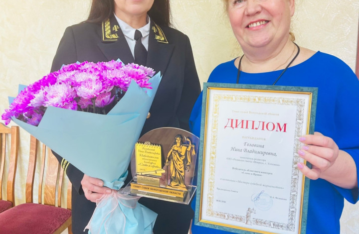 19 марта 2026 года председатель Устюженского районного суда Копылова Н.В. в торжественной обстановке вручила награду победителю областного конкурса «Слово и Право» в номинации «Мастера судебной журналистики» заместителю редактора АНО «Редакция газеты «Вперед» Головиной Нине Владимировне.